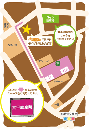 ピンクの大平助産院の看板が出ている場所に止めてください。